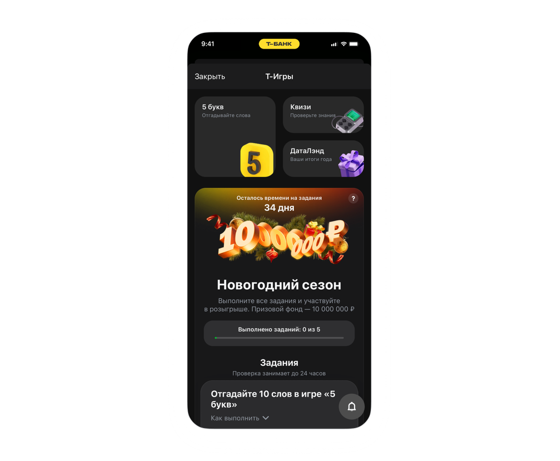 Все задания Новогоднего сезона собраны на вкладке «Т-Игры». Ищите ее в разделе «Город» → «Все сервисы» или через поиск.