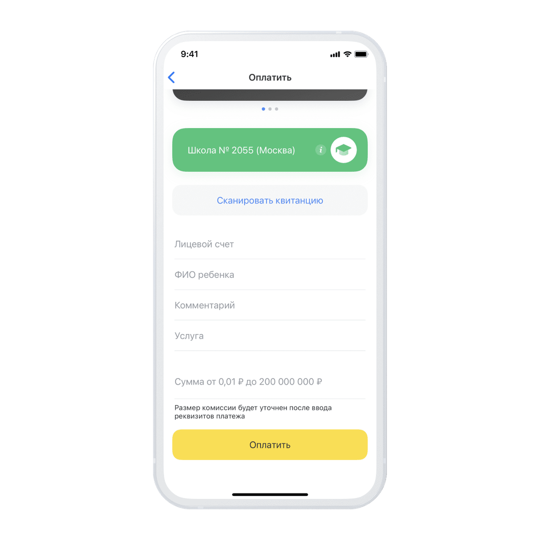 Реквизиты можно найти в квитанции или запросить в учебном заведении. После этого введите БИК банка-получателя, номер счета и ИНН получателя. В поле «Назначение платежа» укажите полное имя ребенка, номер договора или лицевого счета и размер платежа.