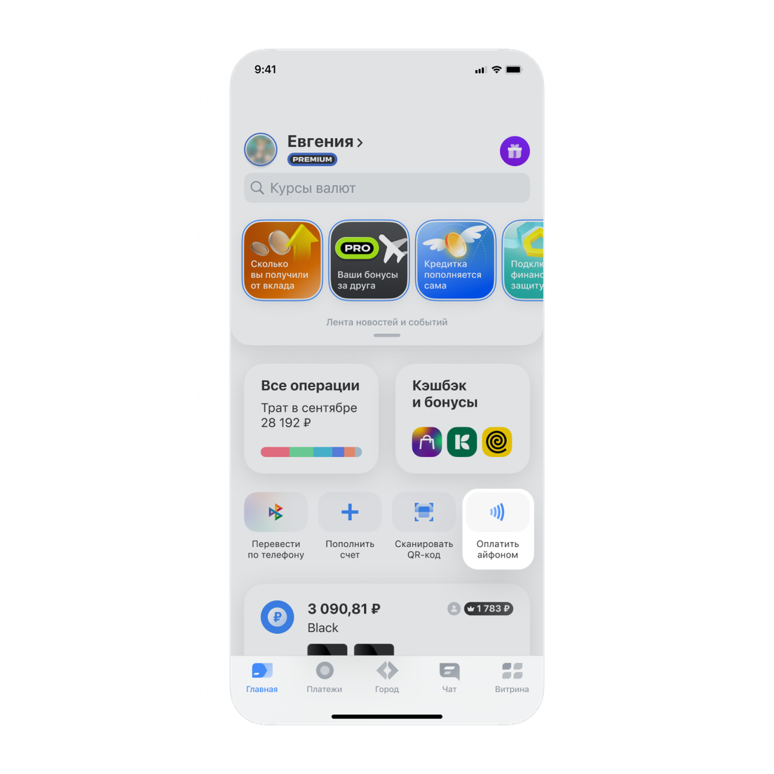 Откройте приложение Т-Банка, на главном экране нажмите кнопку «Оплатить Айфоном». При первой оплате разрешите приложению искать устройства рядом через Bluetooth — нажмите «Разрешить».