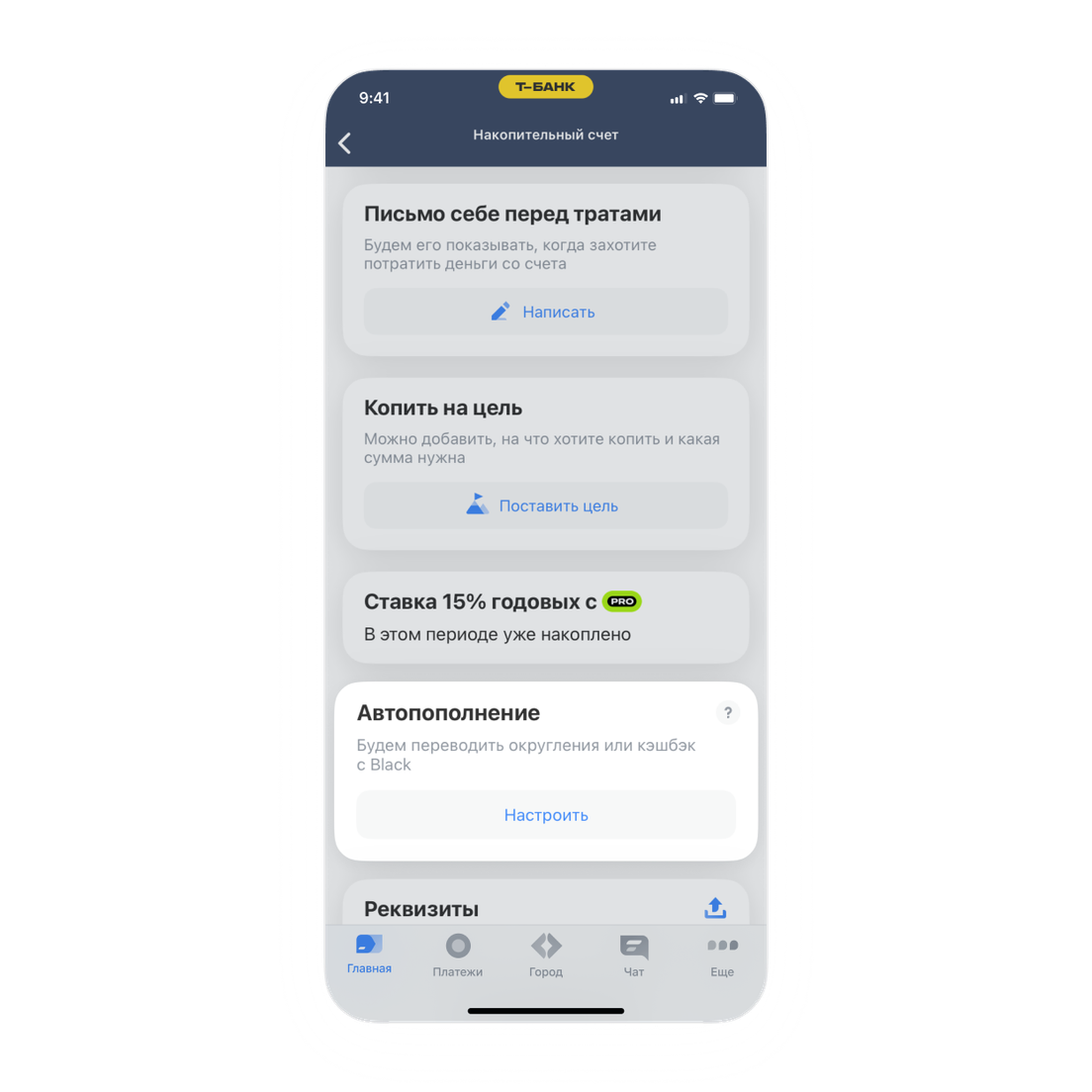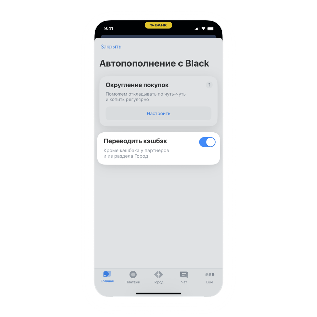 Чтобы настроить автоперевод кэшбэка, выберите накопительный счет на главном экране приложения → «Автопополнение» → «Настроить» → «Переводить кэшбэк».