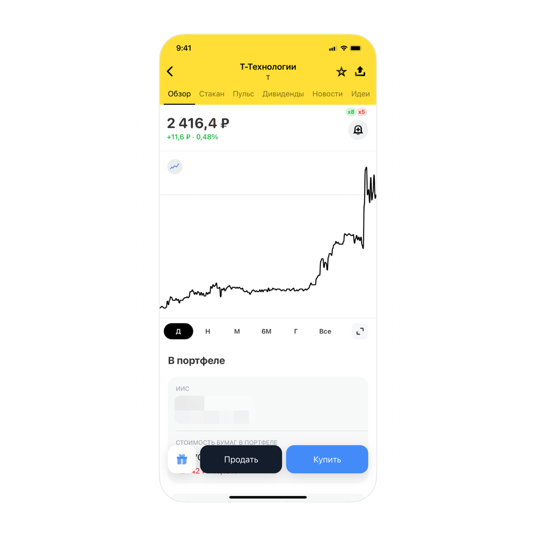 - В приложении Т‑Инвестиции выберите ценную бумагу, которую хотите подарить, и нажмите «Подарить».