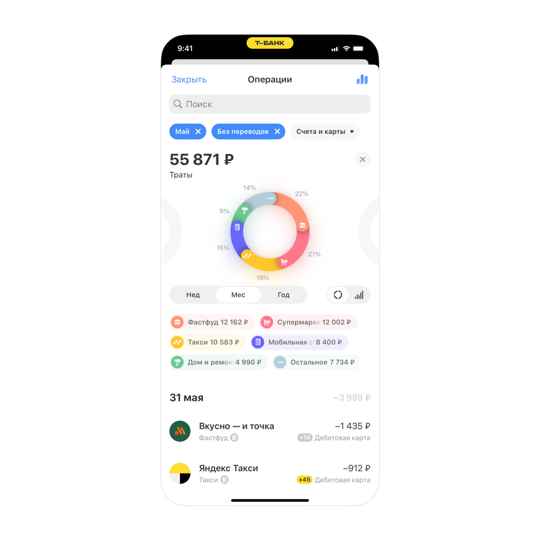 Еще можно посмотреть статистику расходов в приложении. Для этого на главном экране выберите «Операции по счету» → «Расходы». Приложение покажет, сколько вы потратили за выбранный месяц. Можно отталкиваться от этой суммы.
