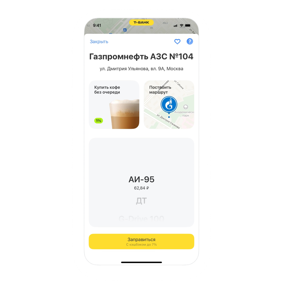 Топливо — поиск ближайшей АЗС и оплата бензина в приложении, подходить на кассу не нужно. За первую оплату топлива через приложение возвращаем 7% трат. Кэшбэк за последующие покупки в сервисе зависит от выбранных категорий кэшбэка на месяц и программы лояльности по вашей карте Т‑Банка.