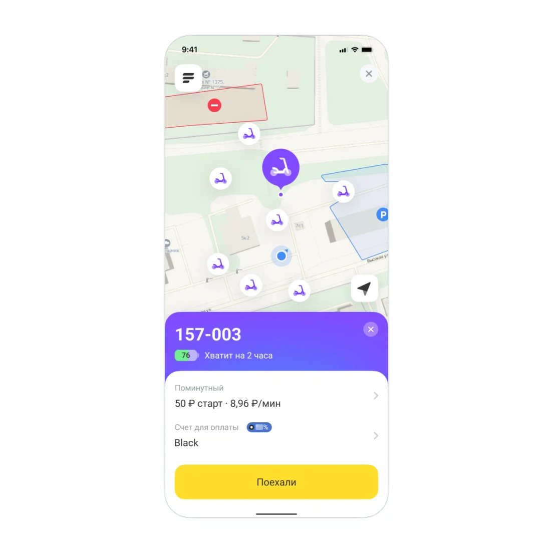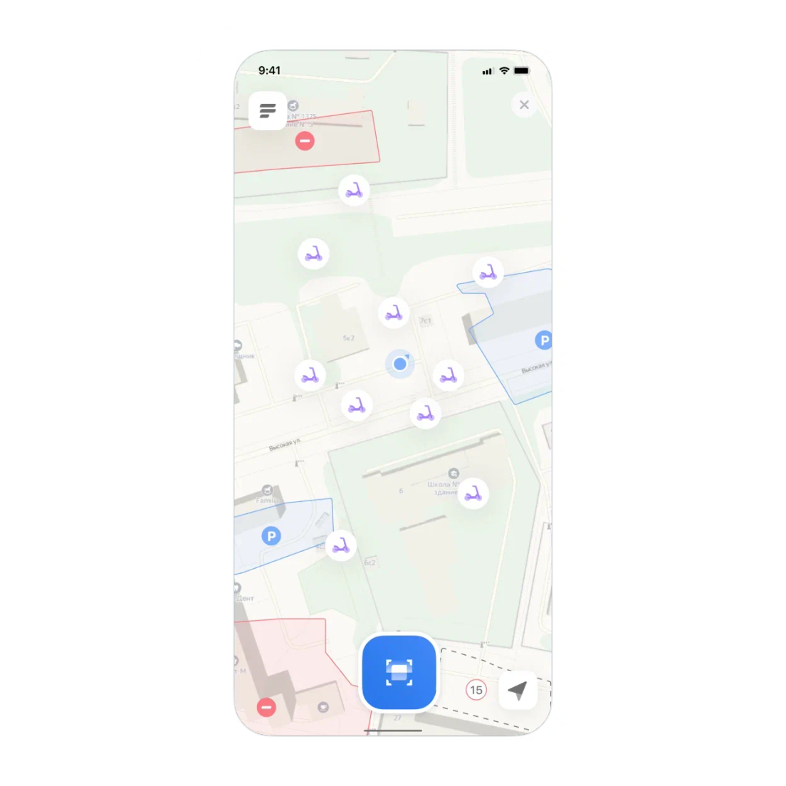При первом входе в сервис попросим доступ к вашей геопозиции, если вы не предоставляли его ранее, чтобы показать на карте самокаты рядом с вами. Пока работаем с одним партнером — шерингом «МТС Юрент».
