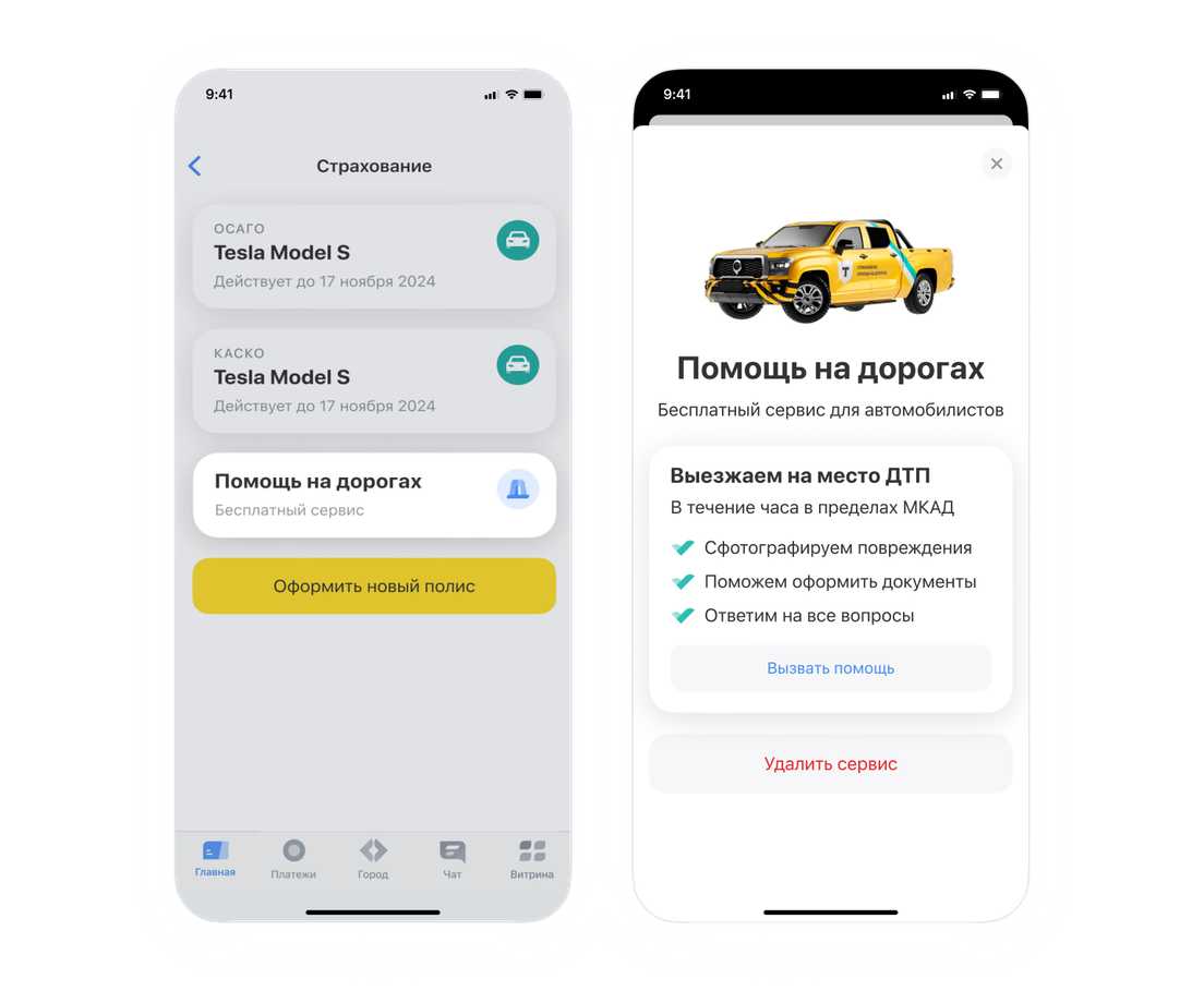 В приложении Т‑Банка на Главной откройте раздел «Страхование», а затем в списке полисов выберите Помощь на дорогах. Если такого раздела у вас нет, напишите в чате Т-Банка — наши сотрудники помогут его подключить.