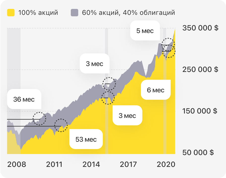 Что будет, если вложить $100 тысяч в два портфеля? Портфель из одних лишь акций будет дольше восстанавливаться и продемонстрирует более длительные и глубокие просадки, тогда как результат будет практически идентичным.