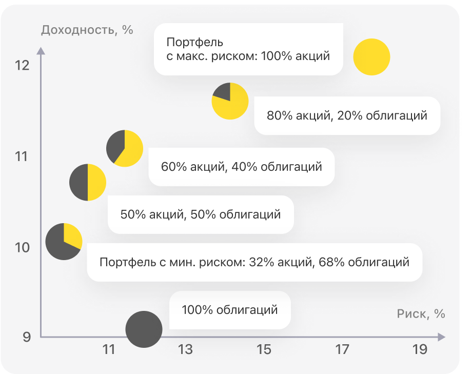 Дело в том, что при добавлении облигаций доходность портфеля снижается гораздо слабее, чем риск.