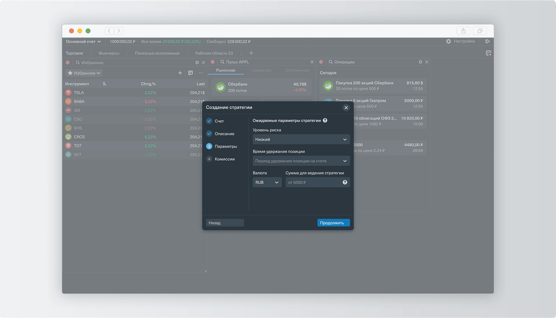 указаны уровень риска, прогнозная доходность или валюта стратегии (эти параметры указываются в карточке стратегии);