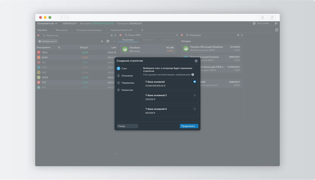 Для создания стратегии нужно выбрать один из ваших реальных счетов. Автоматической привязки счета к стратегии не произойдет