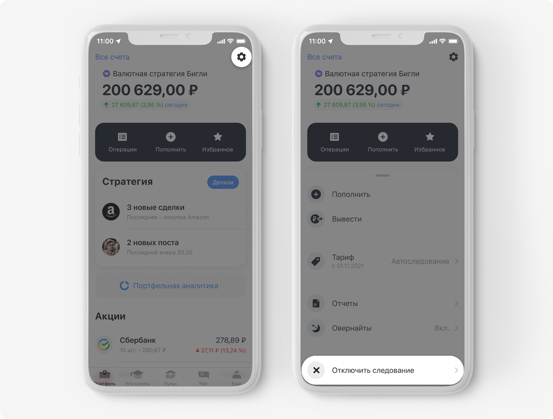 Помните, что после подключения стратегии вы не сможете самостоятельно покупать или продавать активы на этом счете, пока не отключите автоследование. А если на нем уже были какие‑то активы, мы выставим заявку на их продажу по текущей цене, чтобы синхронизировать ваш портфель с портфелем стратегии. Если какие‑то из активов есть в подключаемой стратегии, их доли приведутся в соответствие с портфелем стратегии, после чего докупятся другие недостающие инструменты.