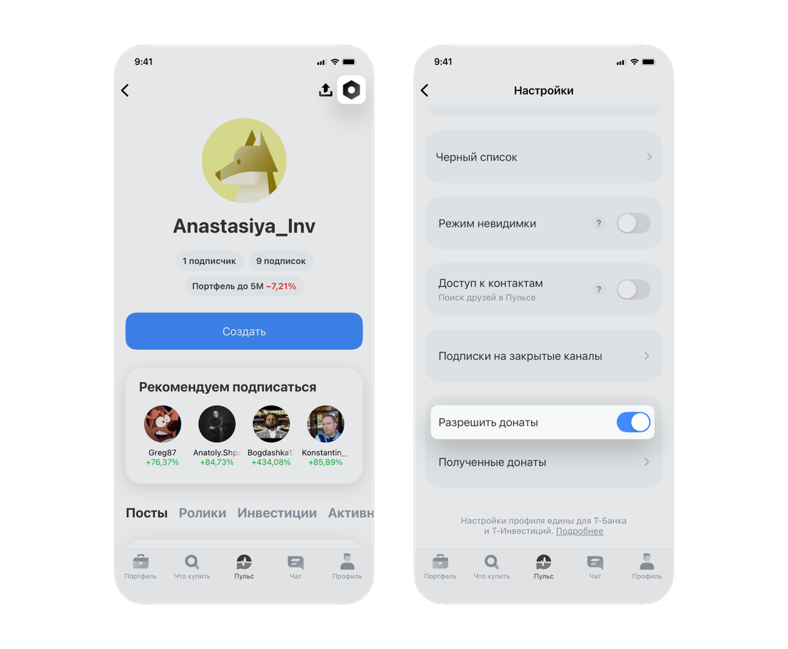 Чтобы включить донаты, в приложении Т-Инвестиций откройте раздел «Пульс» → ваш профиль → значок ⬢ в правом верхнем углу, включите тумблер «Разрешить донаты».