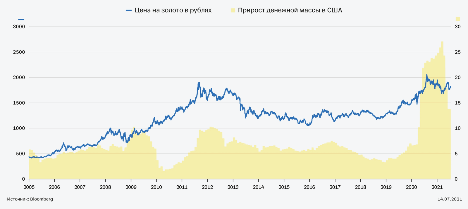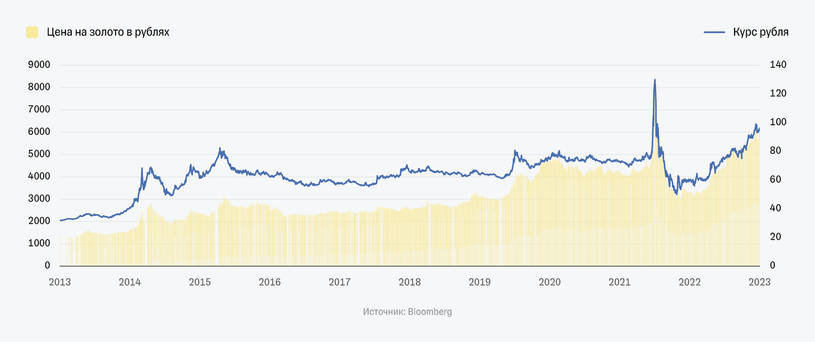Цена золота в рублях традиционно следует за курсом рубля к доллару. Помимо того, что золото — это металл, его также зачастую рассматривают как некоторую универсальную валюту. Цены на товары условно можно измерять как в национальной валюте, так и в золотом выражении. Таким образом, в периоды ослабления курса национальной валюты она теряет покупательскую способность, в то время как золото ее сохраняет. Или, другими словами, цена на золото в национальной валюте растет.