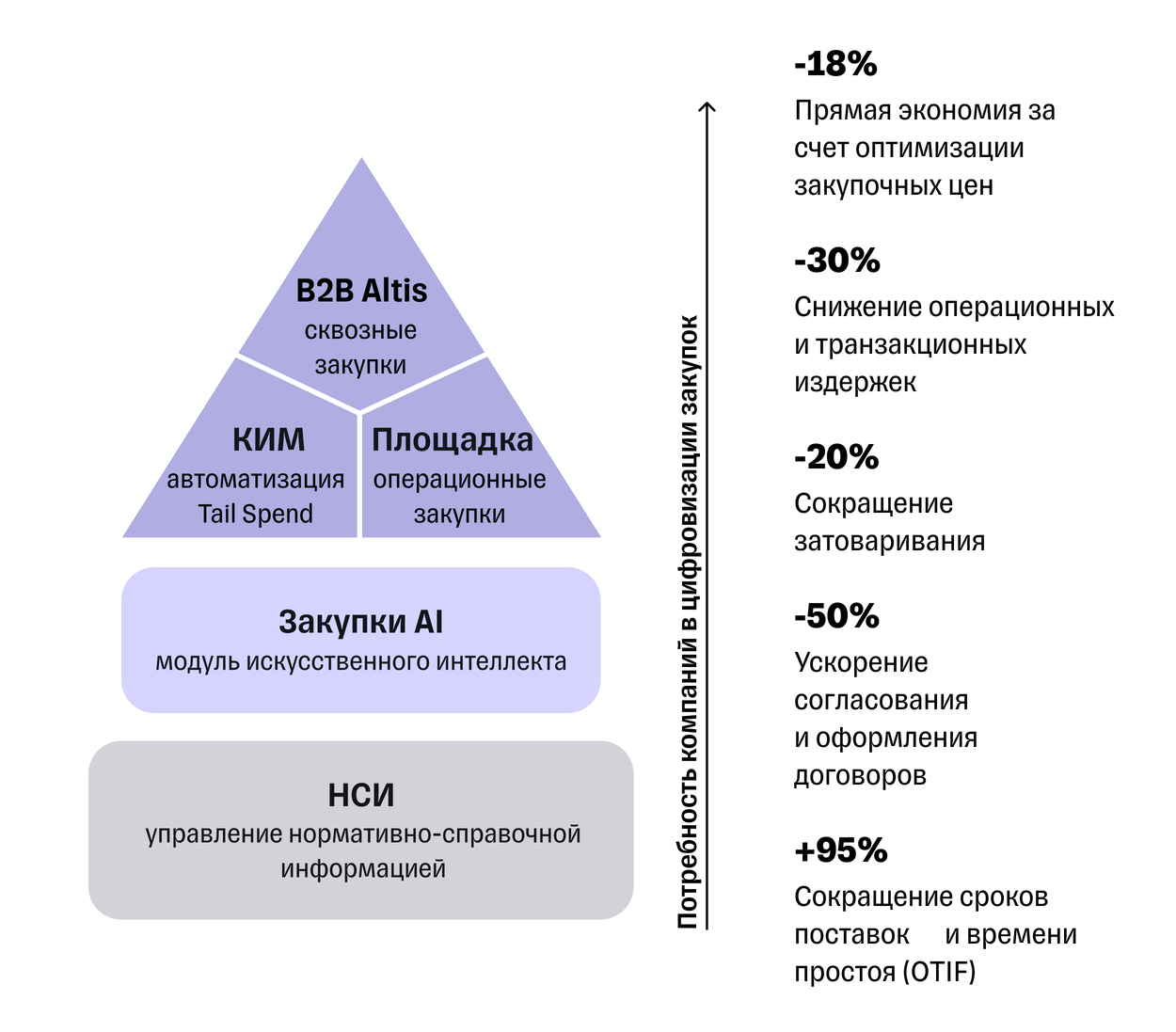 Одним из ключевых решений является B2B Altis — облачная платформа собственной разработки, автоматизирующая полный цикл закупок: от заявки до оплаты. Система охватывает тендеры, рамочные контракты и управление поставщиками и признана Минцифры отечественной альтернативой SAP Ariba.