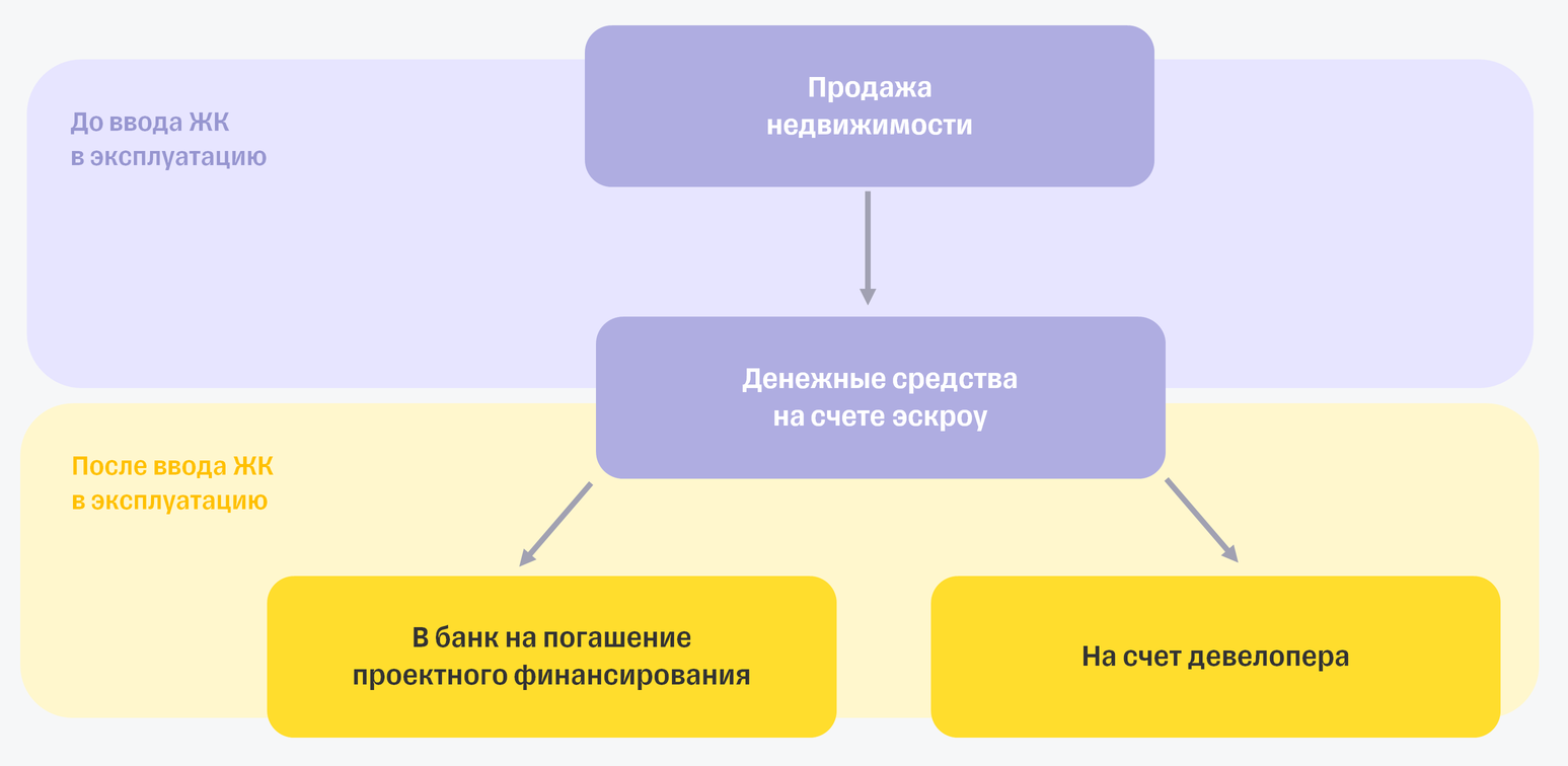 Суть данного подхода заключается в том, что при реализации недвижимости девелопер не получает денежные средства от покупателя сразу. Вместо этого они отправляются на специальный счет эскроу в банк, который выдал девелоперу проектное финансирование на строительство жилого комплекса.