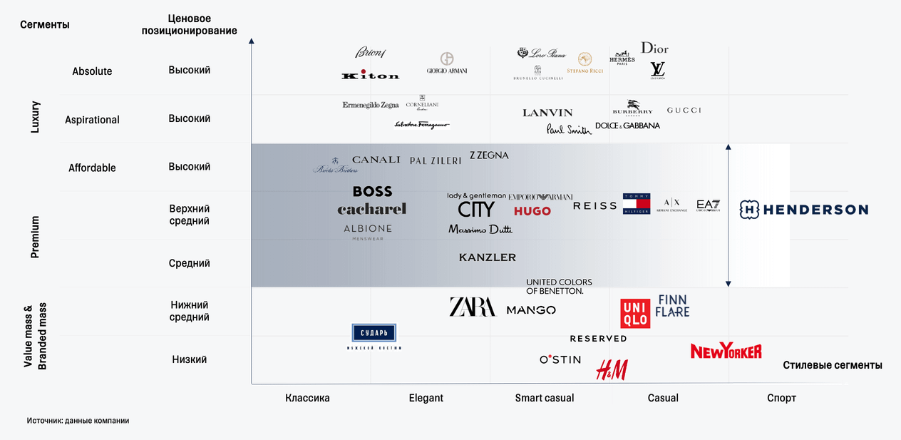 На графике ниже можно наглядно сравнить Henderson с другими игроками на рынке одежды. Как правило, представленные конкуренты занимают достаточно узкую ценовую нишу и сочетают в своем предложении в среднем