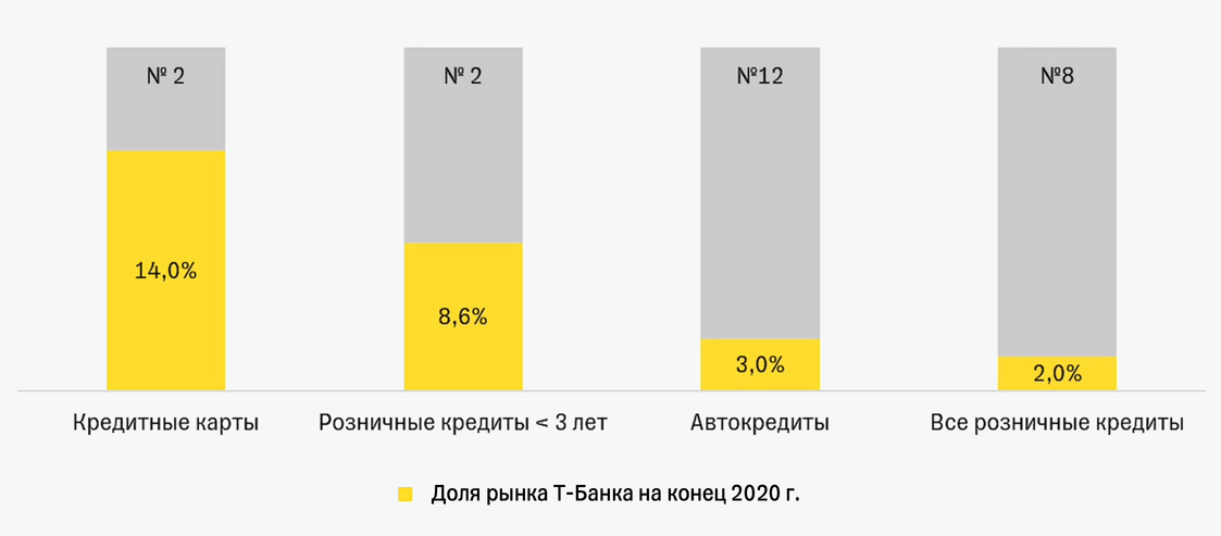 В кредитах Т‑Банка видит дальнейшее свое преимущество и силу. Сейчас он второй после Сбера на рынке кредитных карт с долей 14,5% и уверенно удерживает эту позицию последние пять лет.