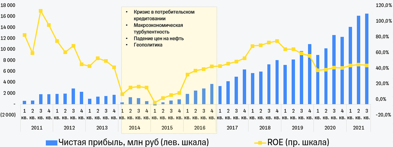 Банк пережил два серьезных кризиса: по сути, при создании банка ー в 2008 году ー и российский кризис 2014-го. Желтым выделена чистая прибыль и рентабельность банка на примере 2014 года.