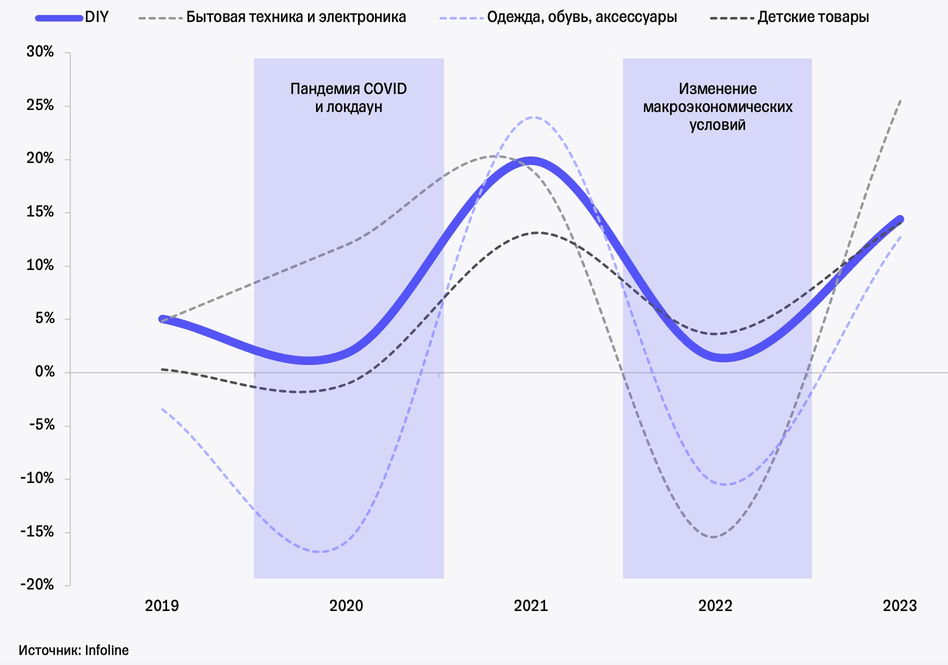 Отметим также, что рынок DIY исторически демонстрирует высокую устойчивость в кризисные периоды и способность к быстрому восстановлению.