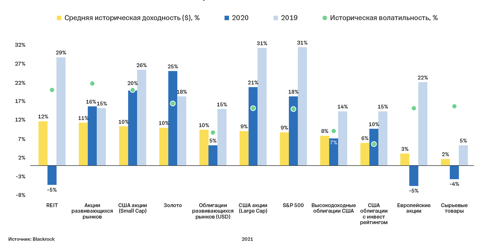 График исторической доходности, представленный выше, наглядно показывает, что доходность большинства классов активов в 2020 и 2019 году сильно выбивается на фоне средних исторических значений. Финансовые рынки имеют тенденцию возврата к среднему, поэтому инвестору не стоит рассчитывать на продолжение периода аномально высокой доходности в ближайшие годы.