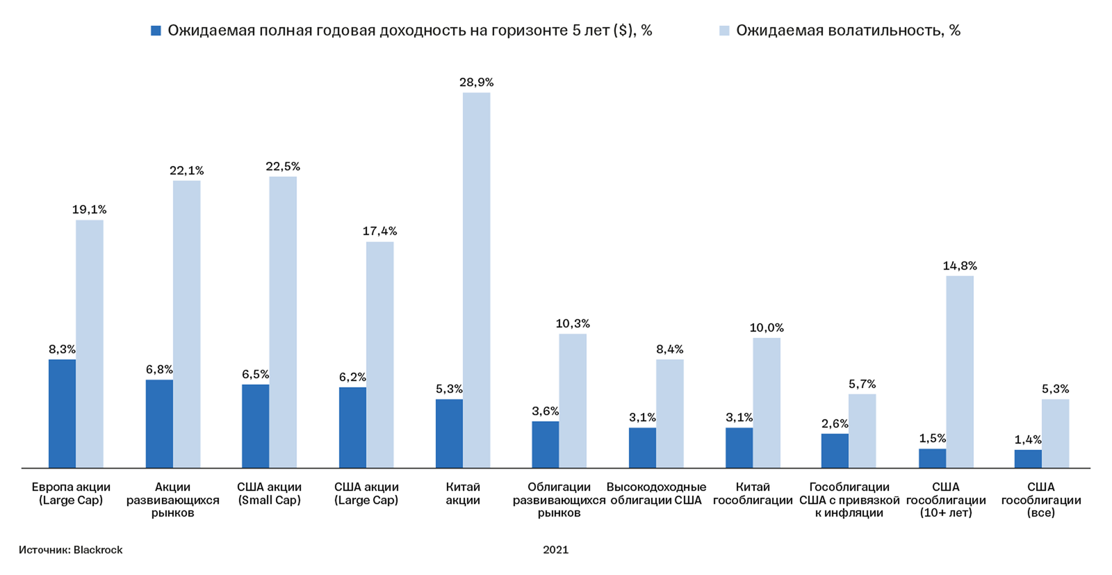 Ниже приведены ожидания по доходности разных классов активов на ближайшие 5 лет, рассчитанные инвестиционной компанией BlackRock.