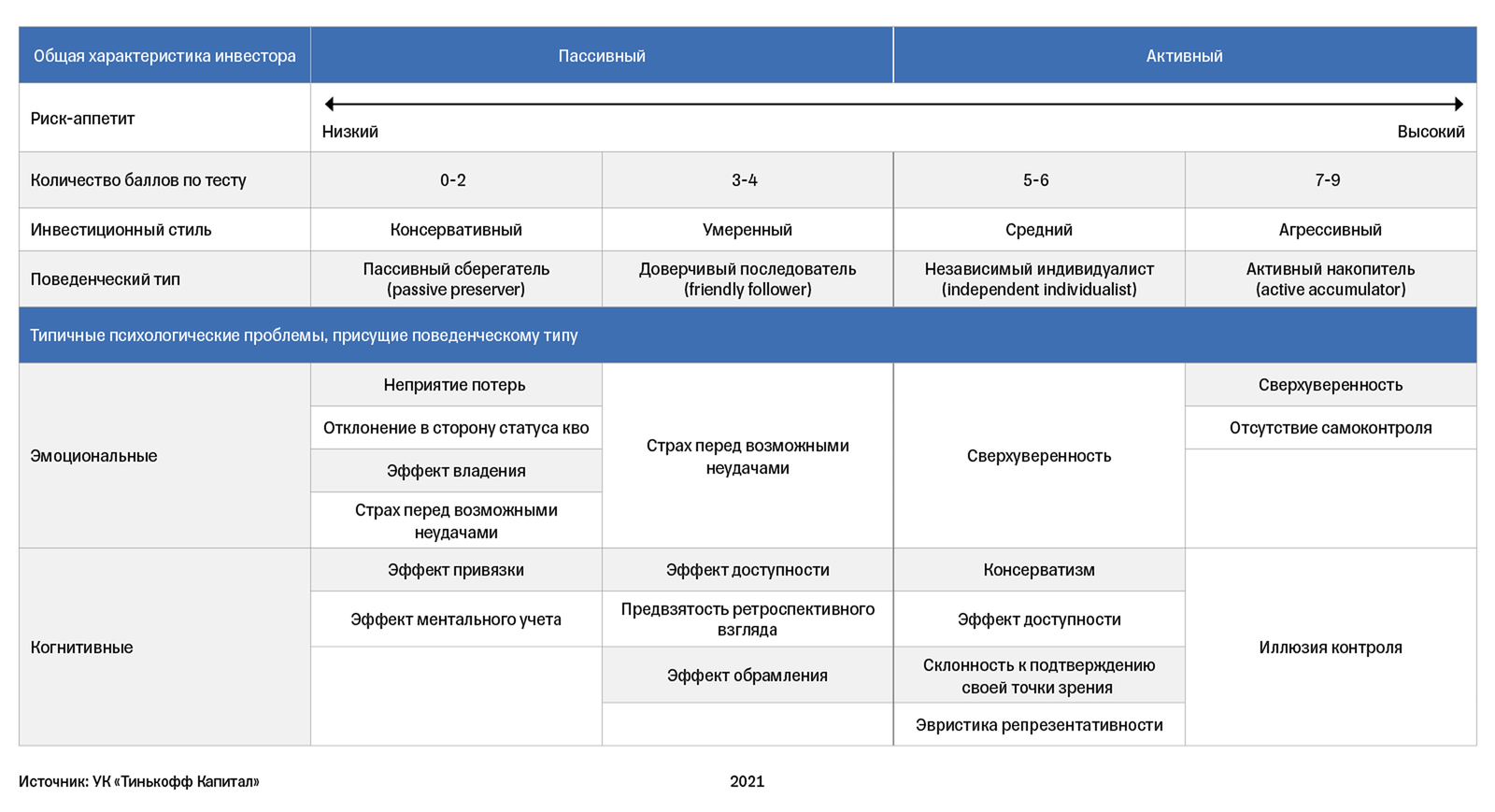 В таблице на концах шкалы риск-аппетита находятся инвесторы, больше подверженные эмоциональным предубеждениям, а в центре шкалы — инвесторы, подверженные когнитивным искажениям. Это соответствует общей логике разделения инвесторов на поведенческие типы. «Пассивные сберегатели» — консервативные инвесторы с низким аппетитом к риску. У них высокая потребность в безопасности, они очень эмоционально реагируют на потерю денег и чувствуют себя некомфортно во время стресса или каких-либо перемен. Также агрессивные инвесторы с высокой толерантностью к риску — «активные сберегатели». Они очень эмоциональны, как правило, страдают от чрезмерной самоуверенности, и им присуща иллюзия контроля: они ошибочно полагают, что могут контролировать результаты своих инвестиций. Между этими двумя крайностями находятся «доверчивые последователи» и «независимые индивидуалисты», которые в основном страдают от когнитивных предубеждений и нуждаются в повышении уровня образования или в более качественном анализе информации для улучшения их инвестиционных решений.
