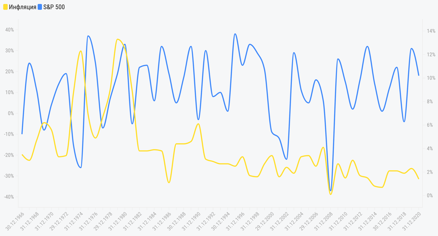 Стагфляция 1970-х была неудачным периодом для рынка акций. Доходность S&P 500 была практически на том же уровне, что и инфляция. Наиболее вероятная причина такого слабого выступления — иррациональное поведение инвесторов, которые верили в то, что инфляция снижает ценность акций. Такую гипотезу в конце 1970-х выдвинул американский экономист Франко Модильяни, который впоследствии стал лауреатом Нобелевской премии по экономике. По его мнению, инвесторы того времени были заложниками «инфляционной иллюзии» и не понимали, что на самом деле акции хорошо защищают от инфляции в долгосрочной перспективе.