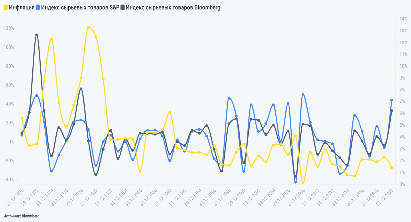 Обычно сырьевые товары хорошо защищают от инфляции — как пример, эпоха стагфляции 1970-х. Но у сырья есть один большой минус — цикличность. Период роста цен сменяет период спада. Поэтому заработать на вложениях в сырье можно, только когда выбран удачный момент для входа и выхода.