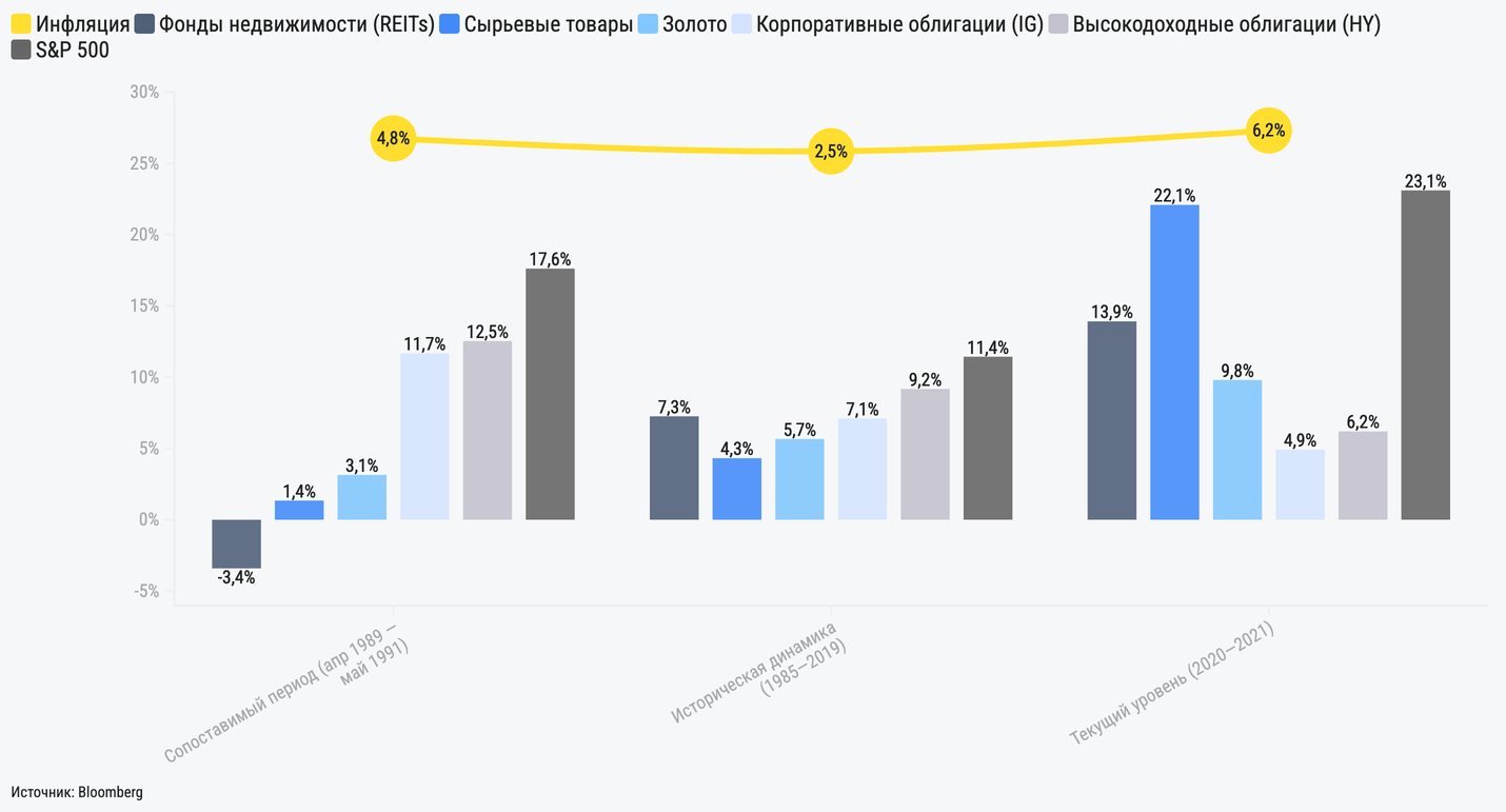 Так, в периоды высокой инфляции рынок акций, золото и сырьевые товары были лидерами по доходности среди всех классов активов.