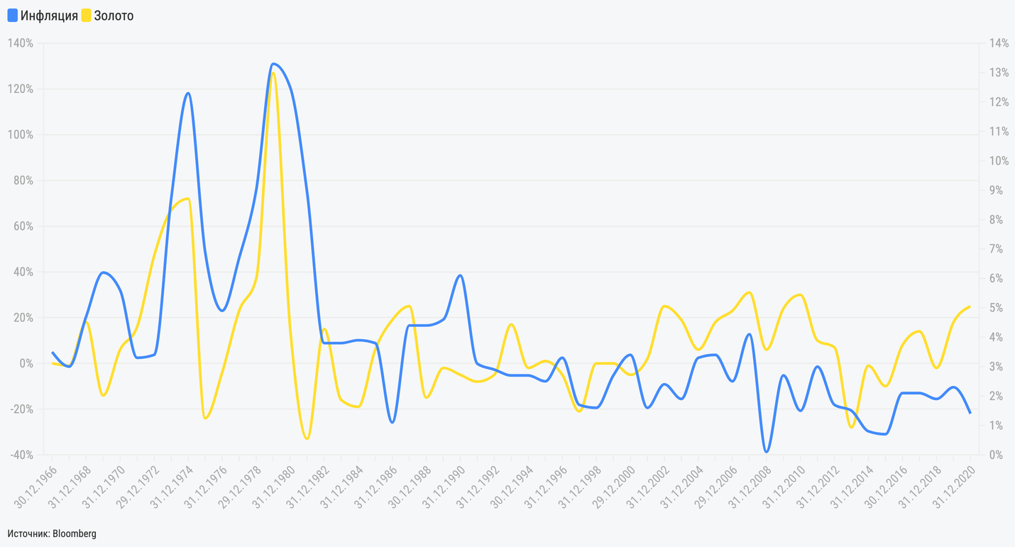 В 1970-х, когда инфляция в США взлетела до небес, то же самое сделало и золото. С 1971 года по январь 1980 года оно подорожало в 24 раза, до $850 за унцию. Однако с тех пор такой одновременный скачок не повторялся. Это может быть связано с тем, что после 1970-х инфляционные ожидания по всему миру снижались. Другая причина — рост золота в тот период был связан не столько с ростом инфляции, сколько с отказом от золотовалютного стандарта.