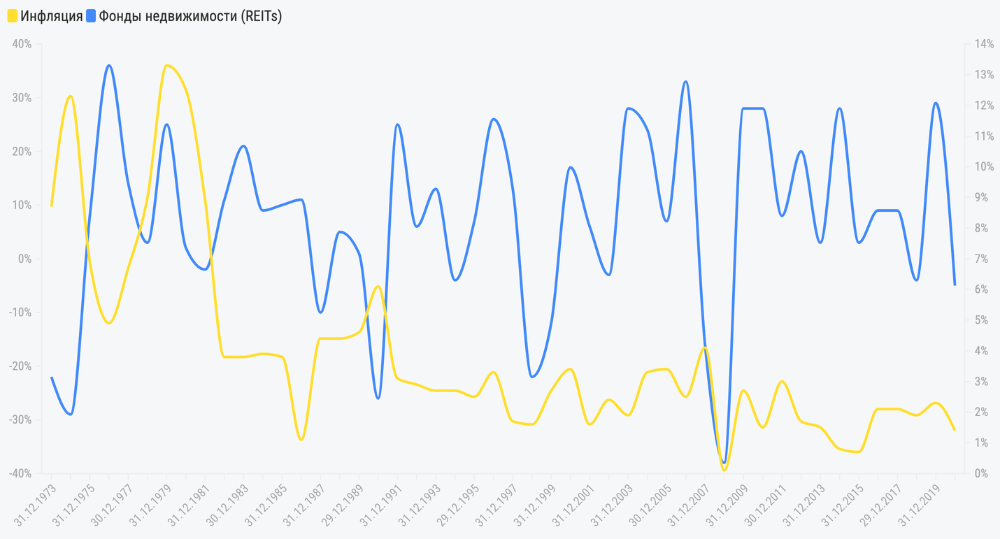 Фонды REIT (инвестфонды недвижимости) как класс активов сложно назвать зависимыми от уровня инфляции, так как ее влияние на отрасль в целом неоднозначно. В теории этот сектор может обеспечивать защиту за счет повышения цен на аренду и недвижимость. Но на практике эта способность сильно зависит от конкретного типа недвижимости (офисная, жилая и т. д.), а также от текущих рыночных ставок в экономике. Например, в период стагфляции 1989–1991 годов REIT не удалось проявить защитные свойства, и доходность была отрицательной.