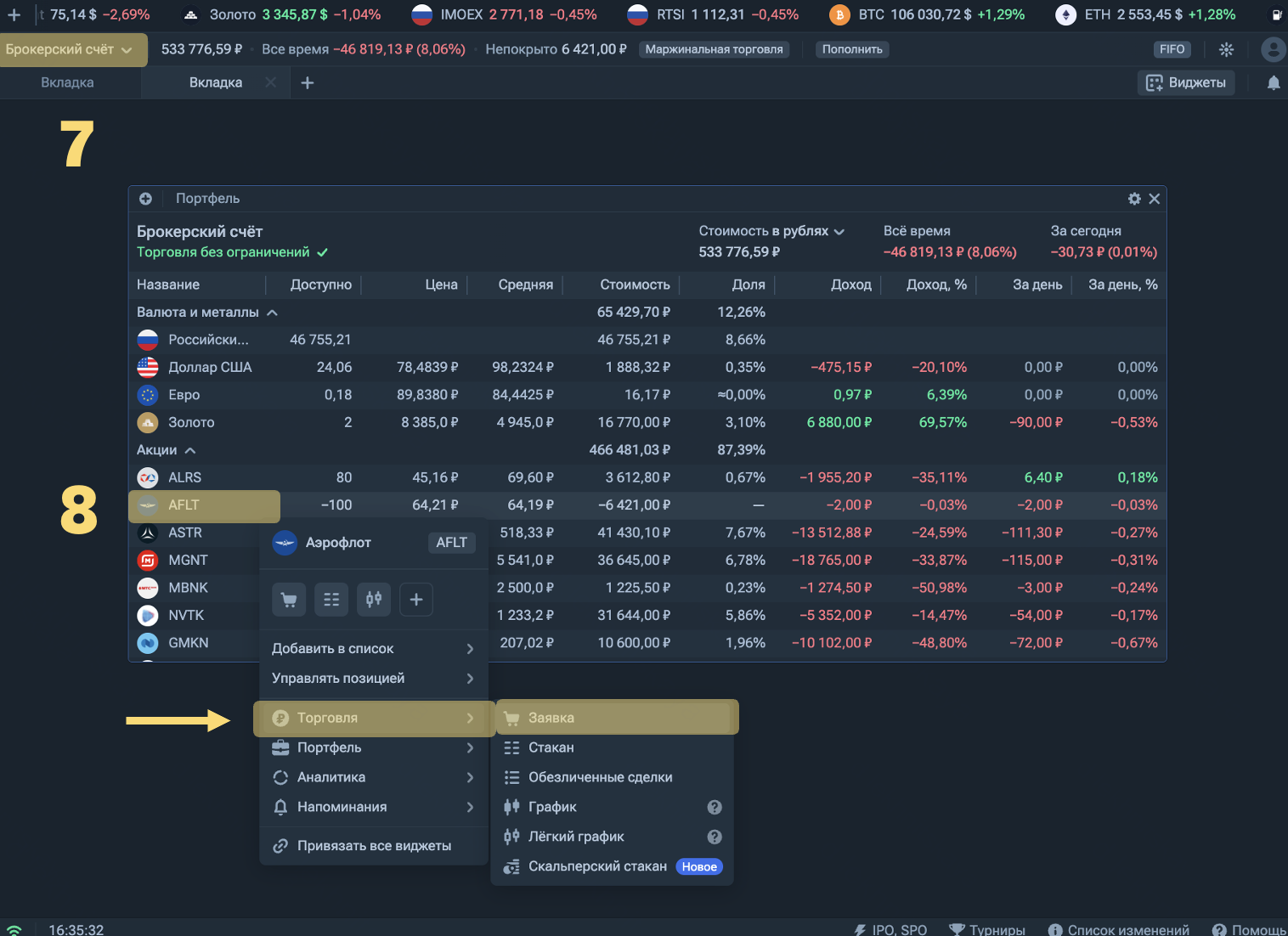 7 — после покупки в обоих случаях определите допустимый уровень просадки и выставьте стоп-заявку. Для этого откройте свой портфель и щелкните правой кнопкой мыши на ценную бумагу.