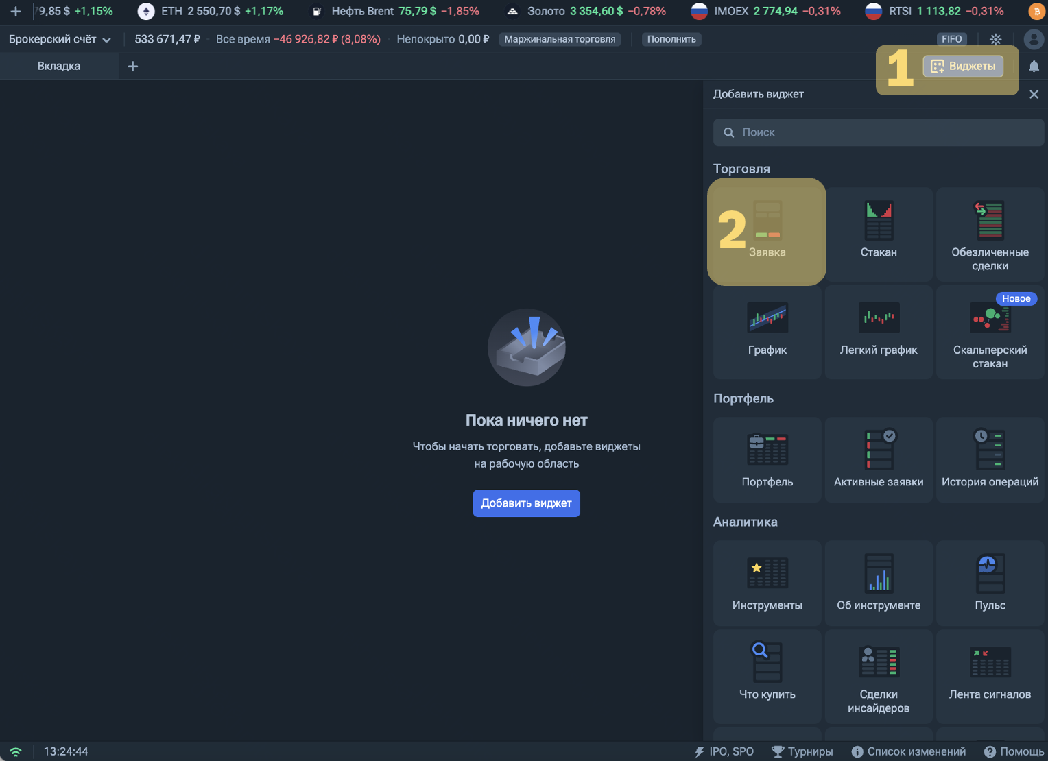 1 — в верхнем правом углу терминала нажмите на значок «Виджеты».