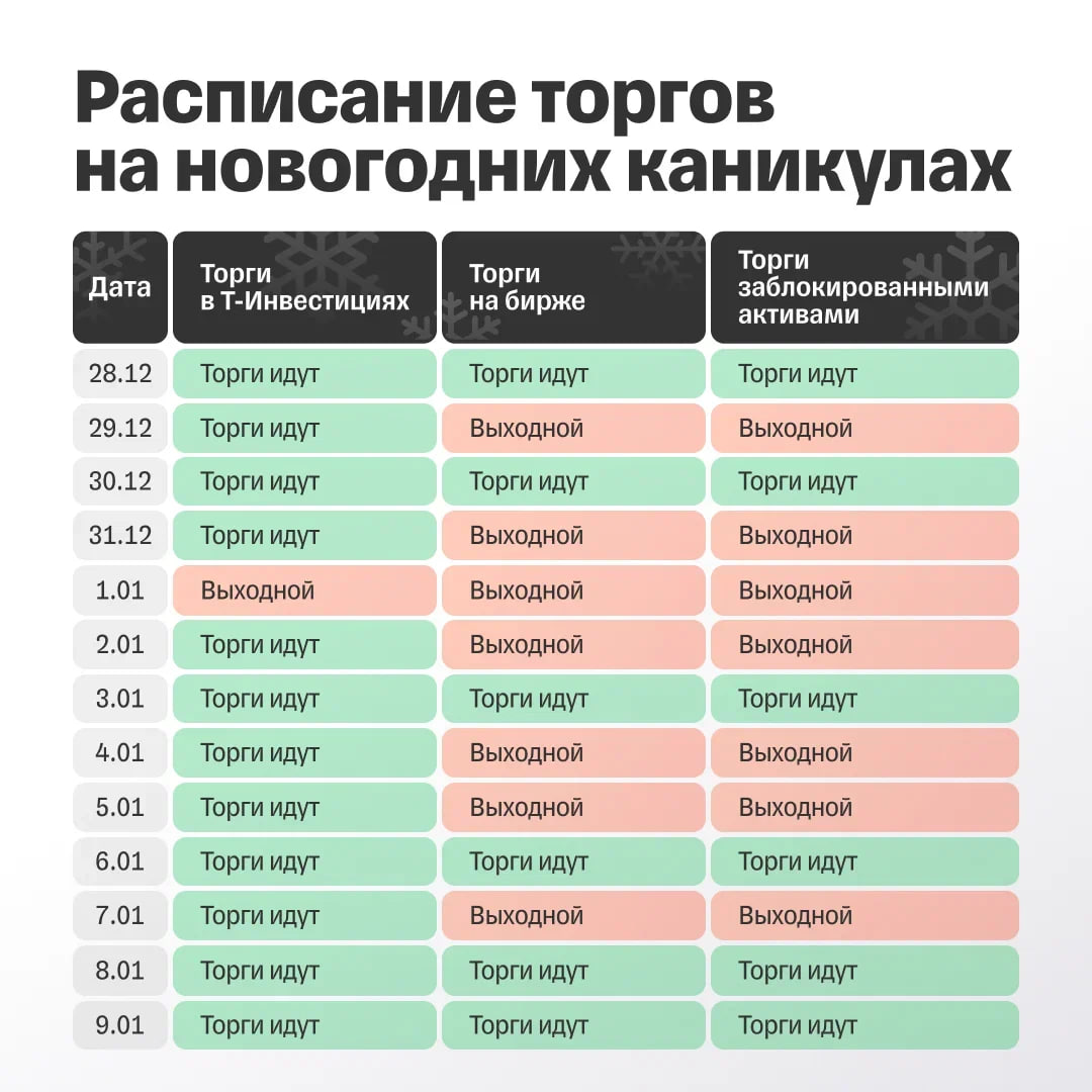 В четверг, 2 января, стартуем в 7 утра, а закончим в 23:50 мск. Рассказали обо всех нюансах торгов по выходным здесь. В дни, когда у биржи выходные, дополнительно с 2:00 ночи будут доступны торги бумагами 10 самых ликвидных компаний. Среди них 👇