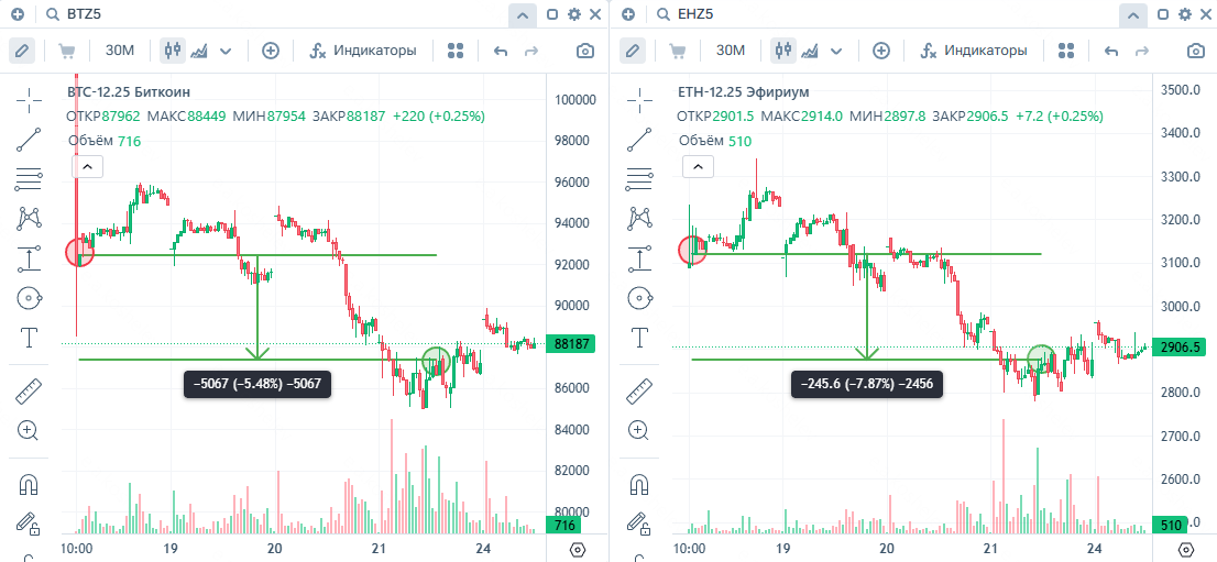 Сделка предполагала короткую продажу фьючерсов BTC-12.25 и ETH-12.25 — инструментов с низким гарантийным обеспечением и высоким эффективным плечом.