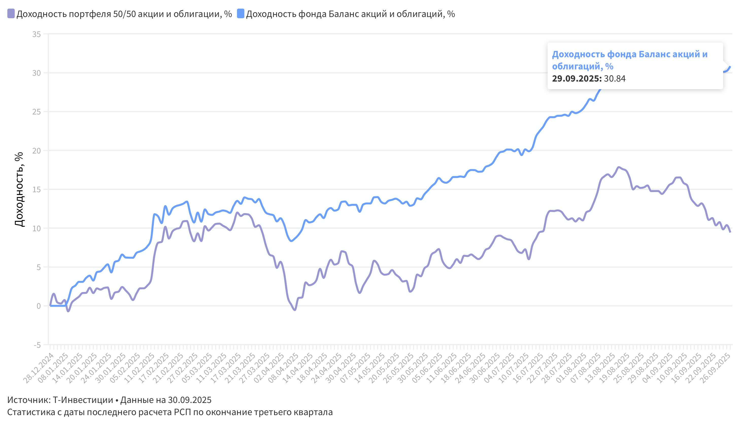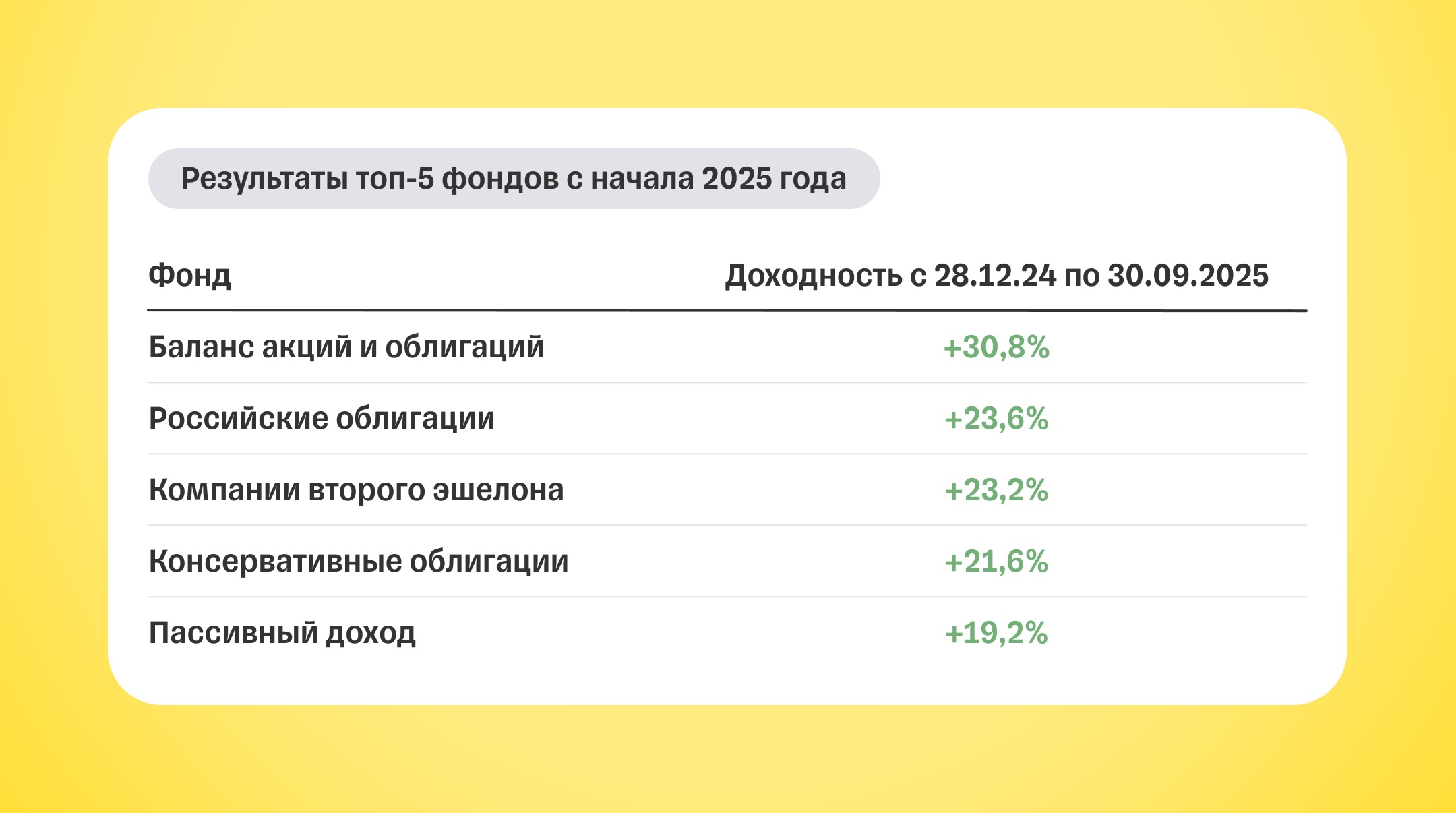 Лучшие доходности с начала года инвесторам принесли смешанные фонды, а также фонды на облигации и золото. Фонд Баланс акций и облигаций, который активно управляет аллокацией между акциями, облигациями и золотом, имеет доходность 30,8% в 2025 году.