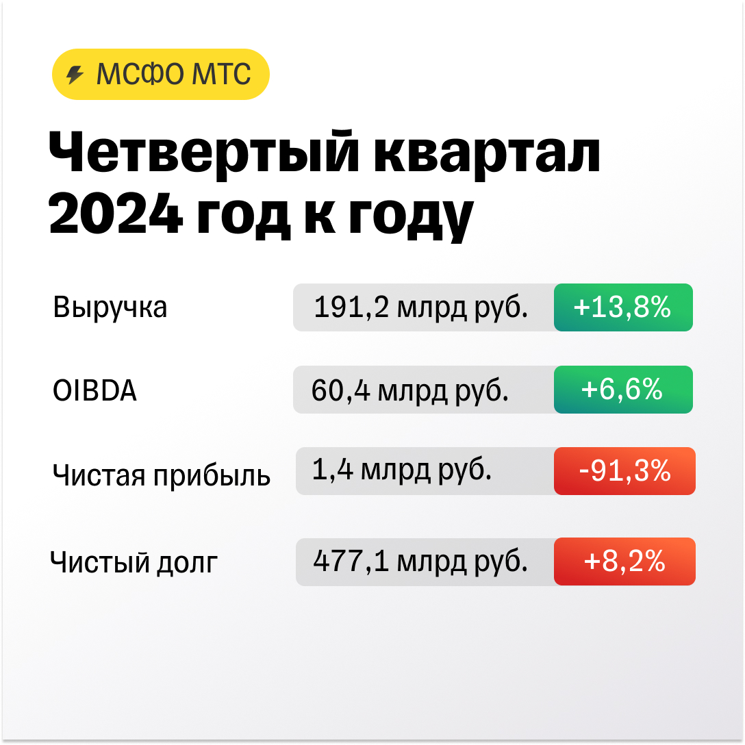 Маржинальность по OIBDA показала снижение на 2,1% год к году в четвертом квартале и на 3,6% за весь 2024-й из-за роста вложений в развитие новых бизнесов, экосистему и персонал.