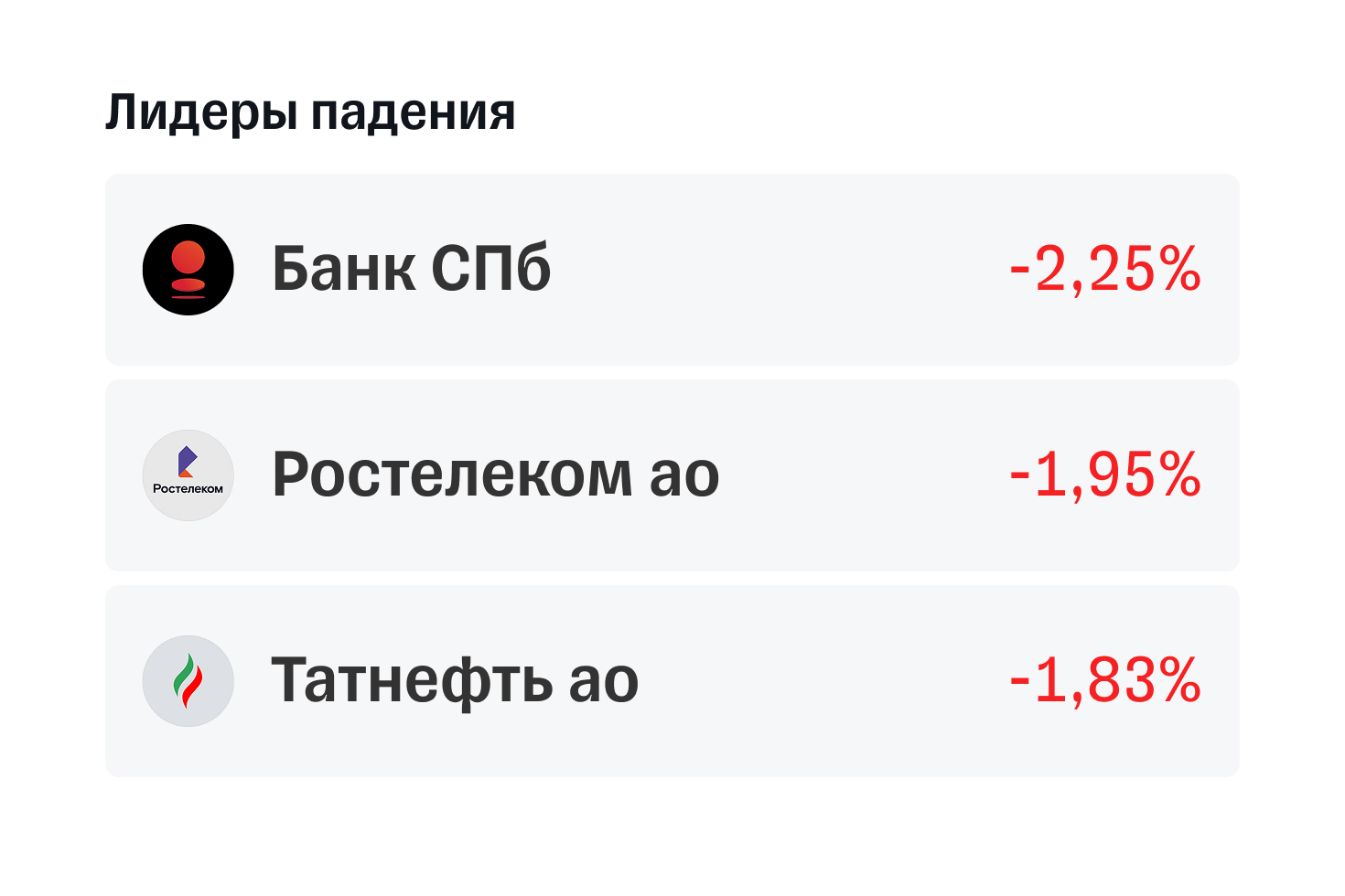 Падения. В списке падений из индекса Мосбиржи: Банк СПб, обыкновенные акции Ростелекома и Татнефти.