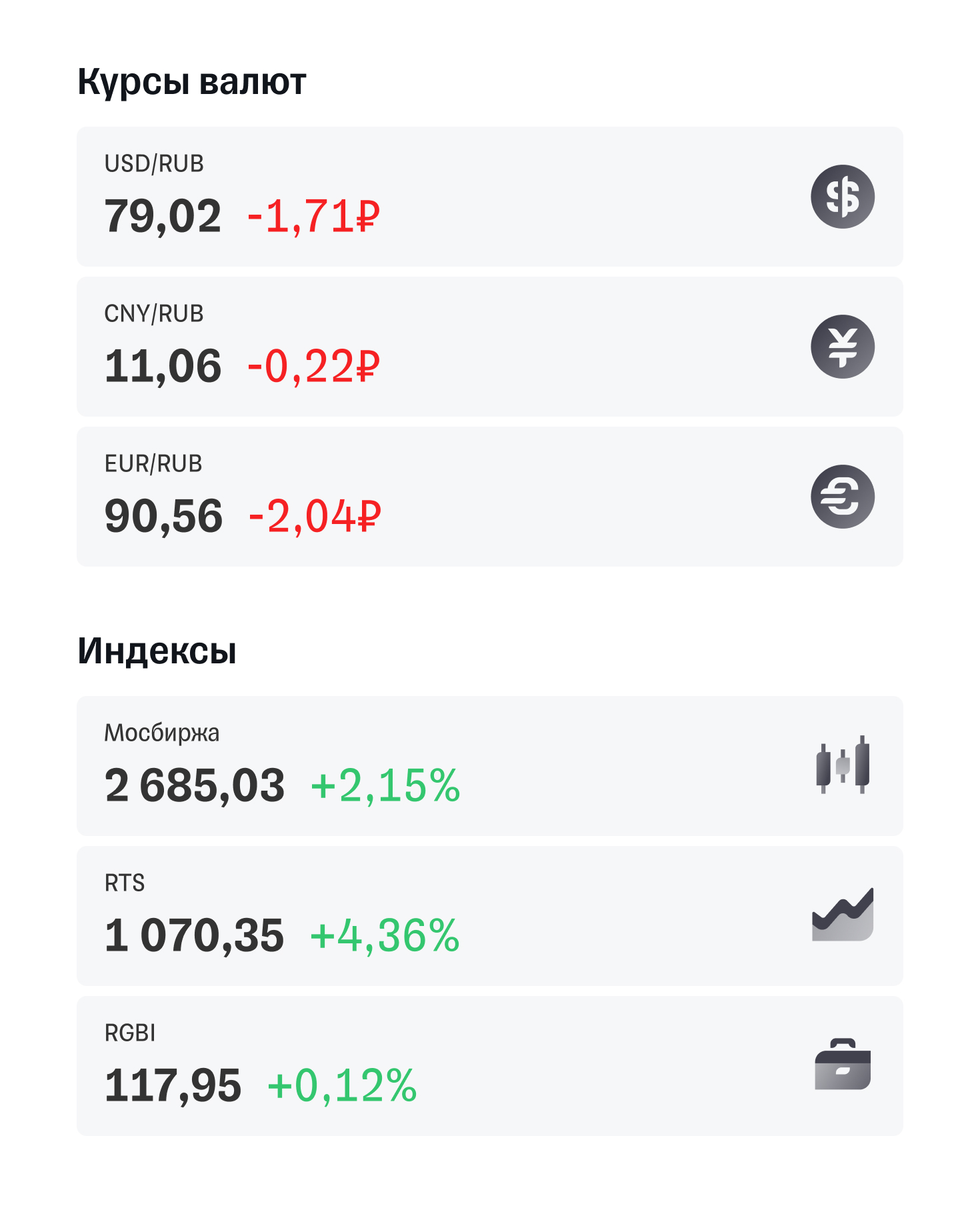 Курс рубля укрепился. Банк России установил доллар ниже 79 рублей впервые за пять недель, а евро — ниже 91 рубля, что стало минимумом с июля. Индекс Мосбиржи закрыл основную сессию в зеленой зоне. Индекс гособлигаций сохранил незначительный рост.
