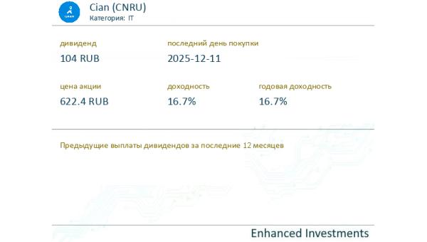 dividend #CNRU Cian (IT) выплатит дивиденды в размере 104 RUB на акцию 2025-12-11, что составляет 16.7% от текущей цены 622.4. ...