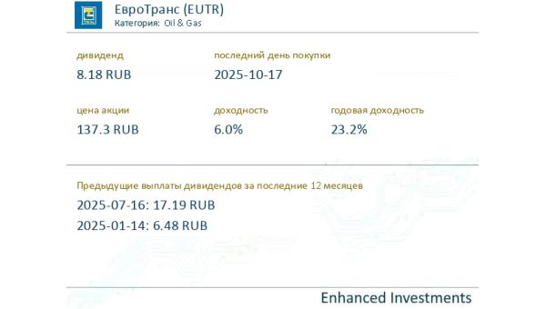 dividend #EUTR ЕвроТранс (Oil & Gas) выплатит дивиденды в размере 8.18 RUB на акцию 2025-10-17, что составляет 6.0% от текущей цены 137.3. В совок ...