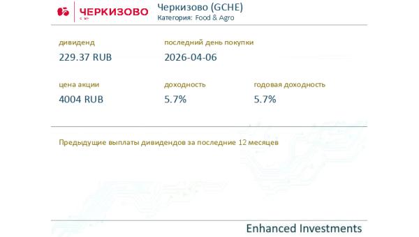 dividend #GCHE Черкизово (Food & Agro) выплатит дивиденды в размере 229.37 RUB на акцию 2026-04-06, что составляет 5.7% от текущей цены 4004. ...
