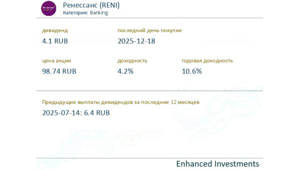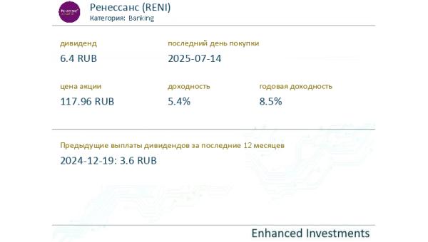 dividend #RENI Ренессанс (Banking) выплатит дивиденды в размере 6.4 RUB на акцию 2025-07-14, что составляет 5.4% от текущей цены 117.96. В совокуп ...