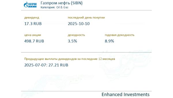 dividend #SIBN Газпром нефть (Oil & Gas) выплатит дивиденды в размере 17.3 RUB на акцию 2025-10-10, что составляет 3.5% от текущей цены 498.7. В с ...