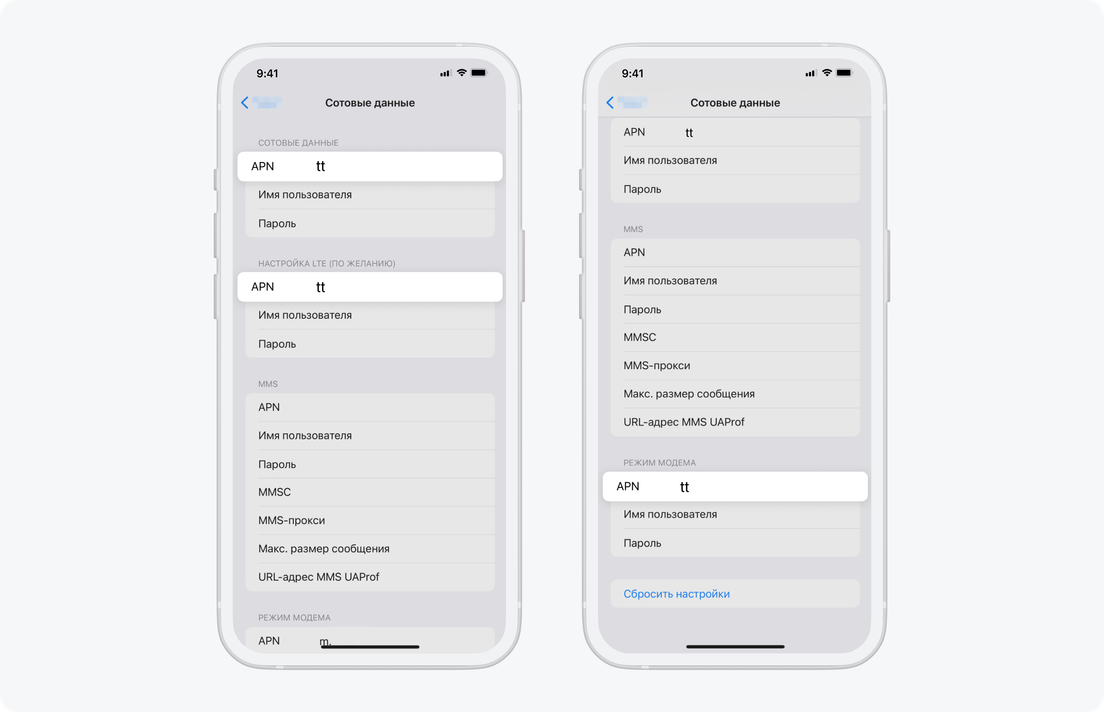 Пропишите точку доступа tt в полях APN в блоках «Сотовые данные», «Настройка LTE» и «Режим модема». Остальные поля оставьте по умолчанию.