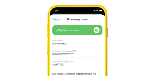 Для перевода напрямую введите имя, номер счета и SWIFT‑код получателя. Укажите сумму