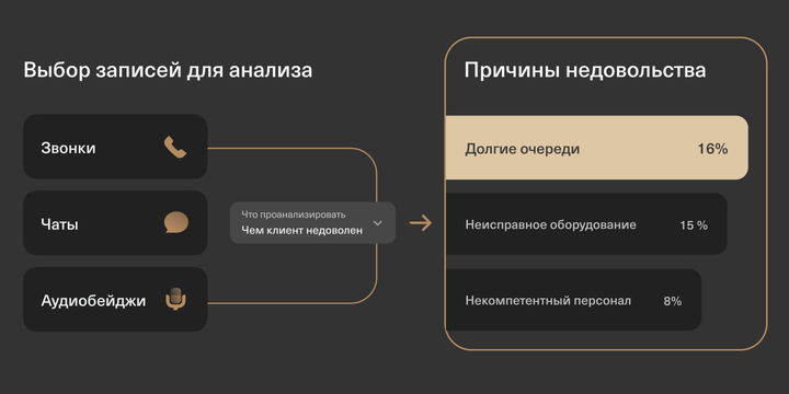 Сервис анализирует звонки и чаты и отвечает на ваши вопросы: например, «Чем клиенты недовольны?» или «Почему пользователи обращаются в поддержку?»