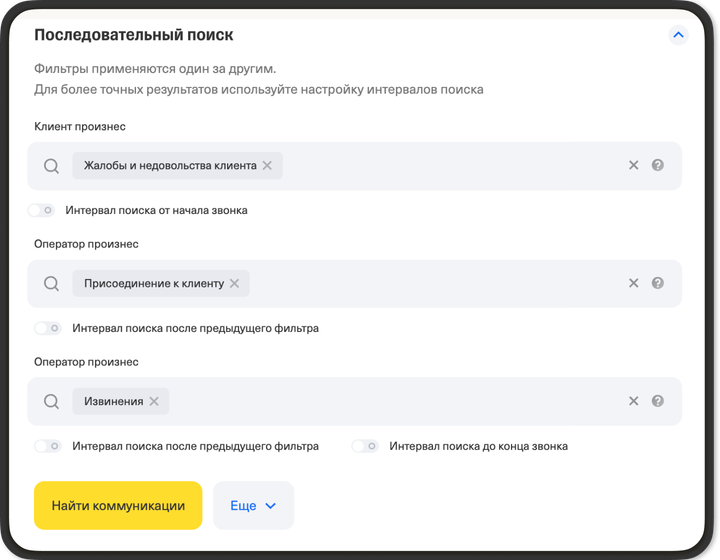 Модели на основе машинного обучения распознают недовольство клиентов по интонации и определяют ключевые причины возражений. Вы также можете найти диалоги, где оператор не сгладил негатив или перебивал собеседника