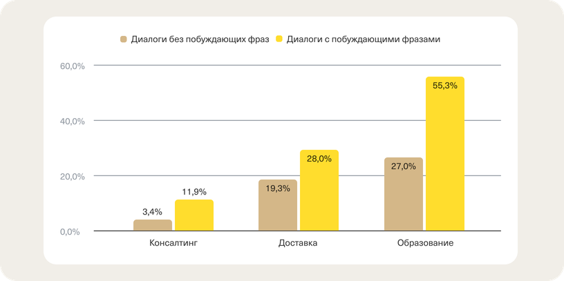 Использование побуждающих фраз в сферах консалтинга, доставки и образования увеличивает конверсию в продажу на 8,5—28,3%. Источник: внутреннее исследование Центра разработки