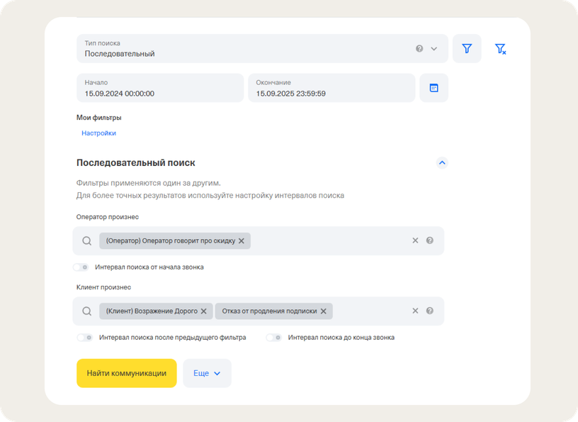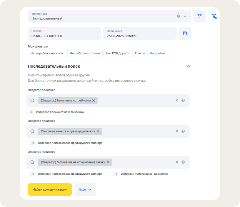 Речевая аналитика проверяет, что операторы выявляют потребности клиентов и не делают предложений «вслепую». Если сотрудники используют один уточняющий вопрос, для поиска диалогов с ним подойдут умные семантические теги. Если вопросов несколько, лучше использовать последовательный поиск.