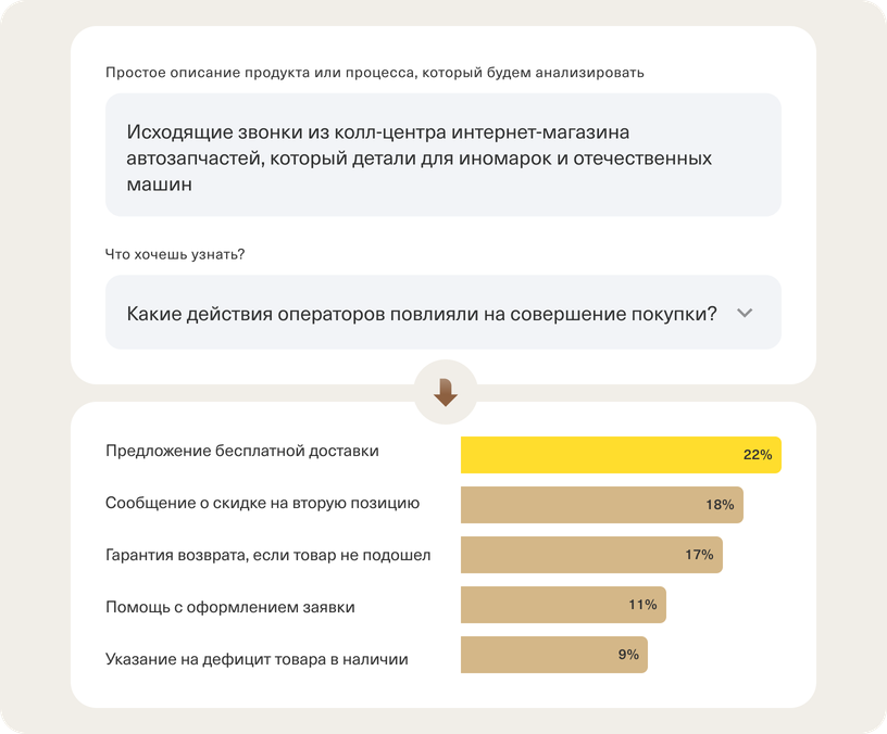 Речевая аналитика находит фразы операторов, которые повлияли на сделку, с помощью Insights — инструмента на основе искусственного интеллекта. Загрузите в Insights выборку диалогов и спросите, какие действия оператора привели к продаже. Инструмент покажет, какие слова и фразы убеждали клиентов лучше всего.
